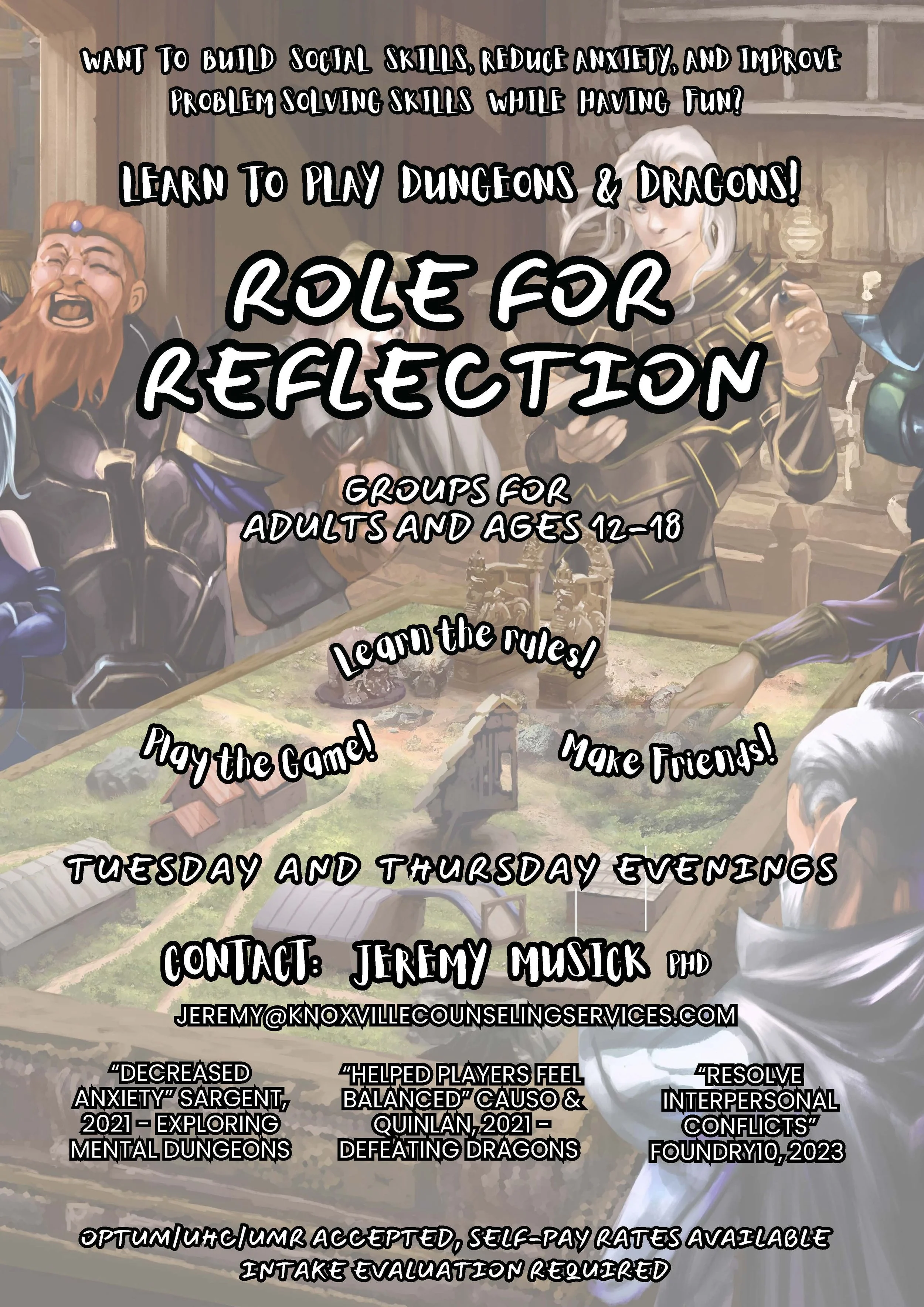 -We are currently offering two therapeutic Dungeons & Dragons groups lead by Dr. Jeremy Musick in our Bearden office location.